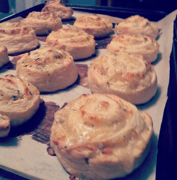 A couple batches of this great hummus recipe (the trick is to whip the tahini and lemon juice before adding anything else), and, since I’m back at my well-stocked parents’ house for the break, many fancy grilled cheeses with fancy double smoked cheese. The day when I can afford my own fancy cheese will be a great day. Also, my dearest friend Julie and I transformed a mountain of butter into these Havarti garlic biscuit pinwheels to reinforce what we all already knew: Mennonite Girls Can Cook.