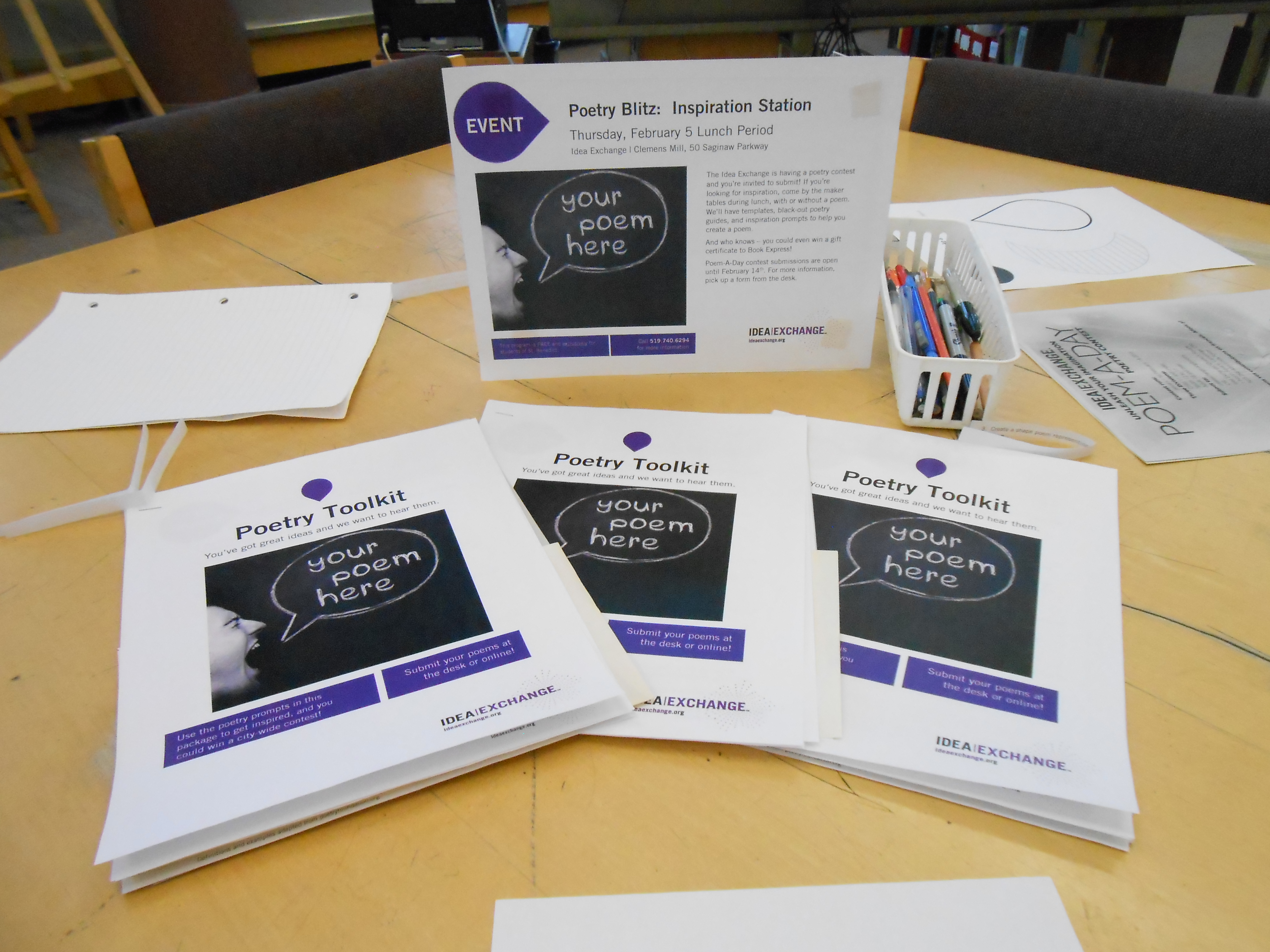 As I expected, even with a little prompting most teens didn’t want to spend their lunch hour sitting by themselves in a loud, crowded space writing poetry. However! Teachers and students were interested in the take-away Poetry Toolkit – especially the Black Out Poetry activity. Almost all of the Poetry Toolkit packages I set out were gone by the end of lunch hour, and I had spoken to 5 different teens about the contest, all of whom were genuinely excited to submit.