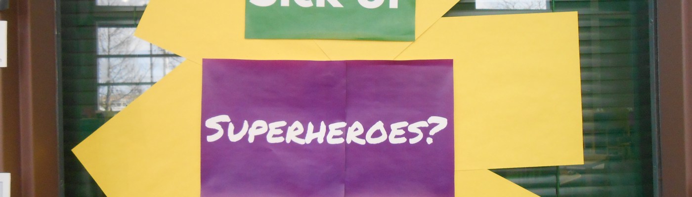 My display back-splash is simple: pages sprayed out into a ring, with the text “Sick of Superheroes? Try these imaginative, thought-provoking, & adventurous graphic novels instead.” I created the text rectangles by using Canva.com. I posted panels from various graphic novels as a border, and included the title and author with an arrow pointing to each. This way people can get a sense of the wide range of art styles present in our collection.