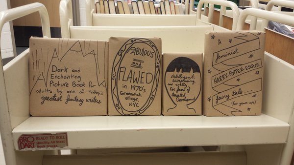 By wrapping the books in kraft paper, hand writing the descriptive blurbs, and giving a little extra thought to the design on the front, I’ve been able to create a unique browsing experience for each patron. People love not judging books by their covers! (And librarians love guessing what I’ve wrapped.)