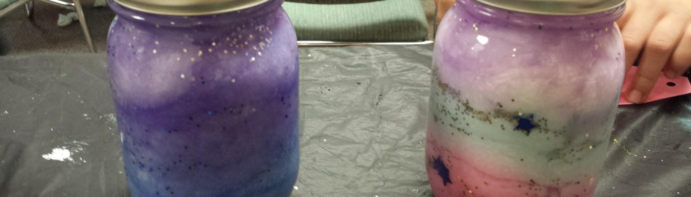 Cool craft alert! Out of all the many many summer programs I’m running this year, the Galaxy Jars registration filled the fastest by far. I personally love the craft – it’s imaginative, beautiful, fun, and just the right amount of messy. When I brought my galaxy jar examples during my class visit blitz, they got a ton of “oohs” and “ahhs,” with kids barely believing that they could make one of those themselves (it helps that they look a bit like slime from a far…)