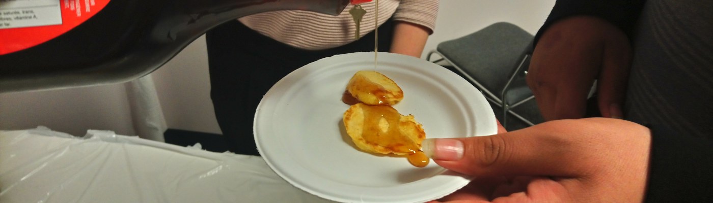 I used a hotplate and a frying pan to make 75+ tiny little pancakes before the program started. As I said to the tweens, I lovingly flipped each pancake to ensure tiny perfection. You could also make giant pancakes and use a cookie cutter to cut them into tiny perfect circles. This was one of the favourite parts of the event, just because they were so tiny and adorable and silly!